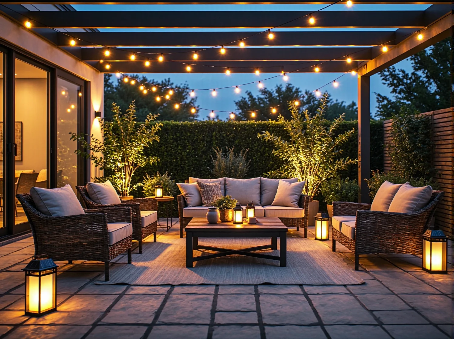 - Oświetlenie wielopoziomowe: Zamiast jednej mocnej lampy na środku ogrodu, projektanci stawiają na wiele punktów świetlnych o mniejszej mocy, rozmieszczonych na różnych wysokościach. Od lamp najazdowych, przez podświetlenie pni drzew reflektorami, po girlandy rozciągnięte nad tarasem.