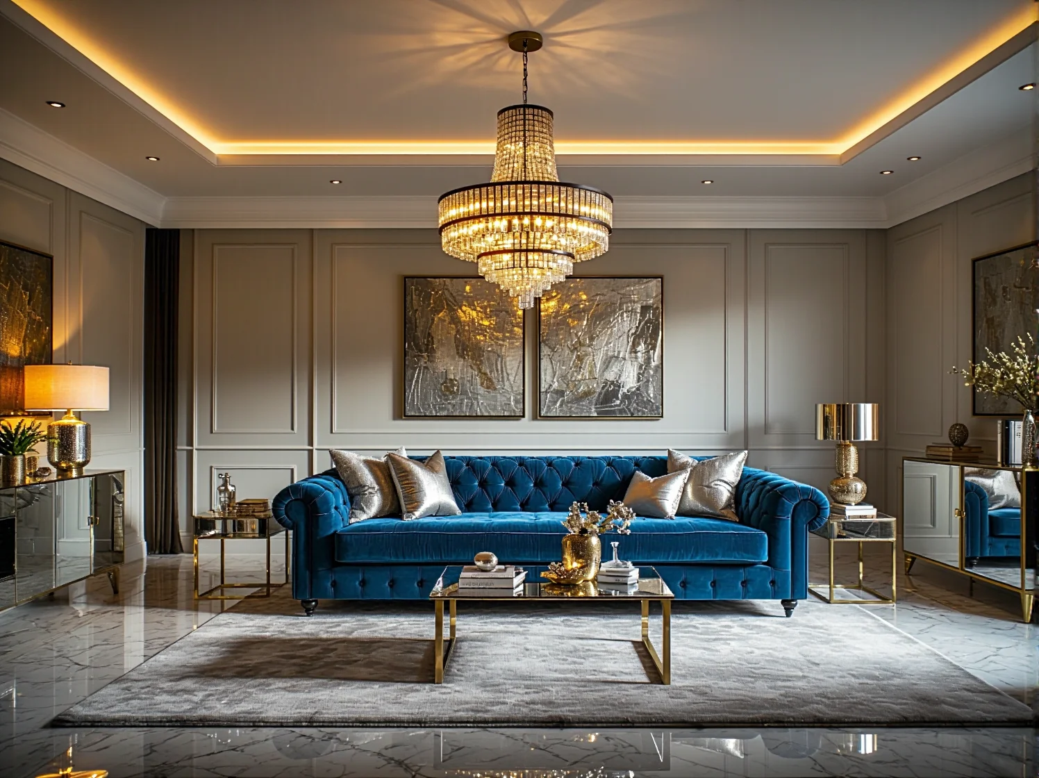 To tutaj dzieje się magia glamour. Kinkiety na ścianach podświetlające obrazy lub lustra, taśmy LED ukryte w sztukaterii sufitowej czy małe lampki stołowe na komodzie. Oświetlenie to ma za zadanie budować nastrój i podkreślać eleganckie detale architektoniczne.